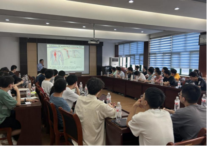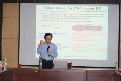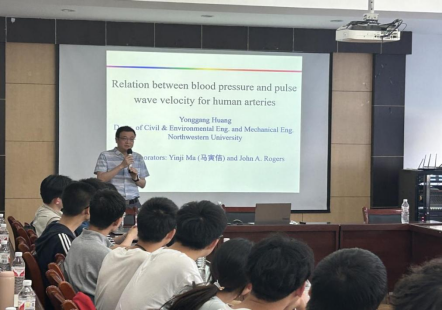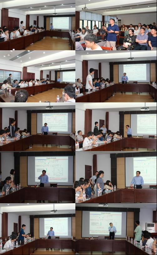 黄永刚首先为师生作学术报告。他以血压连续动态监测为交叉研究案例,引出了生物力学和医学领域提出的基于脉博波速重构血压的数学模型,详细阐述了其模型的由来及其局限性,结合严格的数学和力学分析实现对传统模型的创新性修正。报告中,他勉励师生,在追求学术科研的道路上,研究选题、力学及数学基础能力储备及学科交叉都很重要,力学能够由简入繁,将一个问题研究的更加精确,数学则能够由繁返简,将复杂问题简单化,从而在实际中获得应用,解决一个问题需多学科知识及能力。他强调,在学习研究中不能迷信权威,要敢于质疑、批判思考。追求真理,验证对错必须通过实验验证,通过多次实验分析以确保结果无误,不能主观臆断。