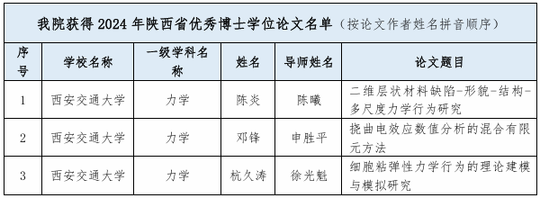 日前,2024年陕西省优秀博士学位论文名单由陕西省教育厅和陕西省学位委员会正式公布,西安交大共26篇论文获选。其中,我院3篇论文获选。