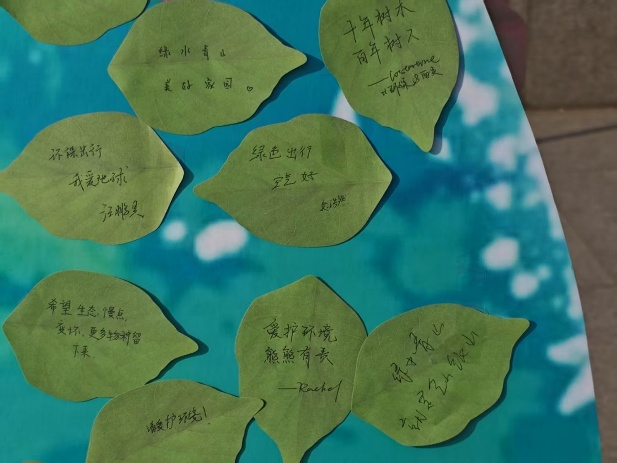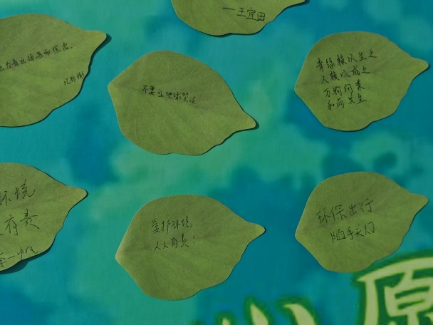 2.种下环保的“树”:参与者写下“减少使用一次性餐具”、“坚持绿色低碳出行”等环保承诺,张贴在“环保树”背景板上,每一张宣言象征着一棵环保之树的叶子;