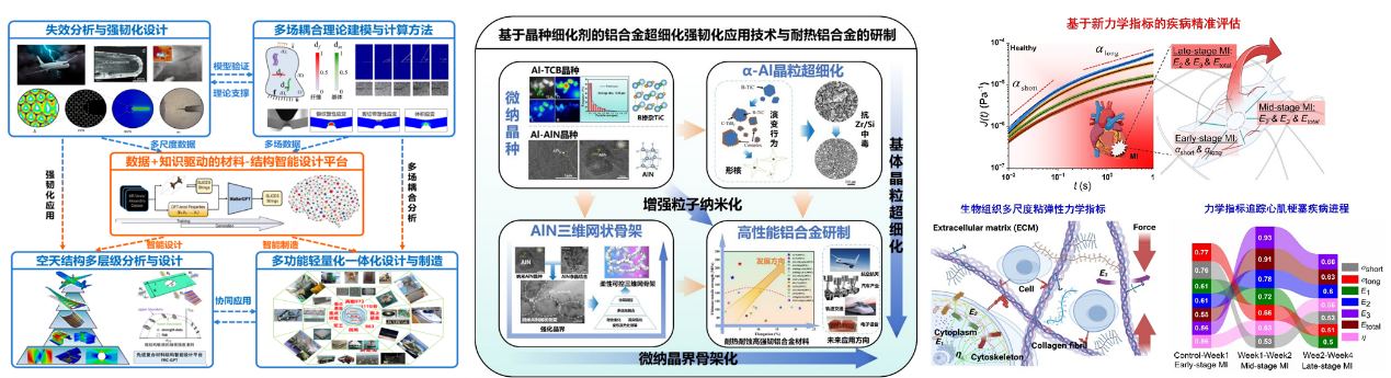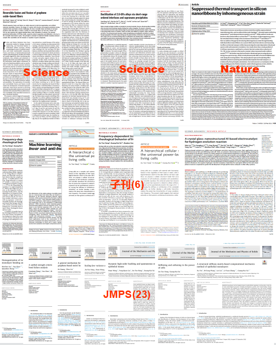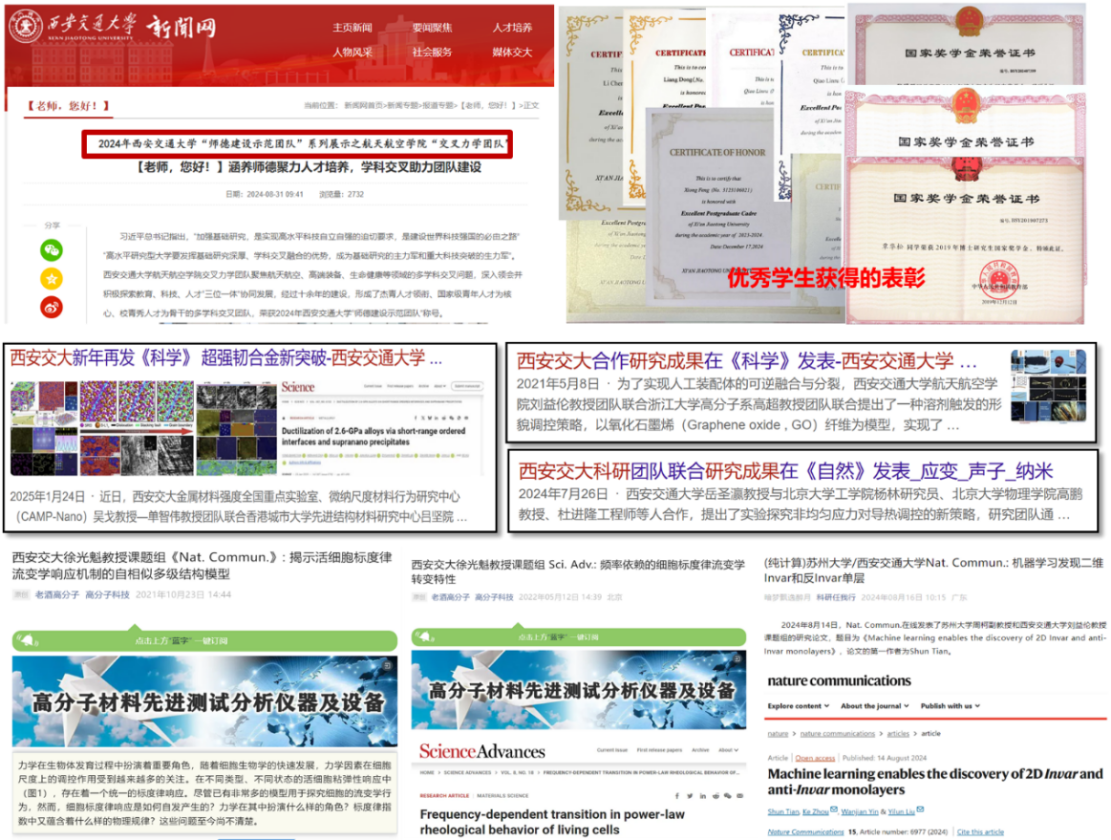 胸怀“国之大者”,锚定解决“卡脖子”问题,是交叉力学团队始终坚守的目标航向与行为准则。围绕空天高性能复合材料多维度变形与响应、生命体重大疾病时空演化过程中的力学难题,团队创新提出基于多尺度力学分析与人工智能的材料设计和疾病精准评估新范式,在多个领域实现突破。 在材料研究领域,团队成功发展微结构敏感强度和挠曲声子热输运理论,研发出2.6 GPa强韧性合金、强韧化及智能化氧化石墨烯纤维,为高端装备材料升级提供关键技术支撑;在生命科学领域,建立考虑细胞和组织结构的多级结构理论,清晰阐明细胞幂律粘弹性行为的形成及调节机制,并创新性提出疾病精准评估的力学新指标,为医学诊断开辟新路径。 亮眼的科研成果获得国际学术界高度认可,团队研究发表于Science(2篇)、Nature等一系列国际顶尖期刊,相关进展还被基金委基金要闻、科学网、Physics World等权威平台广泛报道。近五年,团队先后承担国家自然科学基金重大项目、国家重点研发计划、国家自然科学基金杰出青年基金、国家自然科学基金优秀青年基金、陕西省杰出青年科学基金等重要项目,科研实力持续领跑。 与此同时,团队积极推进产学研深度融合,主持建立“西安交大-成兴国投无序新材料实验室”“成兴国投—西安交大医疗器械力学交叉与健康诊断中心”两个千万元级校企研究院,加速科研成果从“实验室”走向“生产线”。凭借突出贡献,团队先后荣获陕西省三秦创新团队、91porn