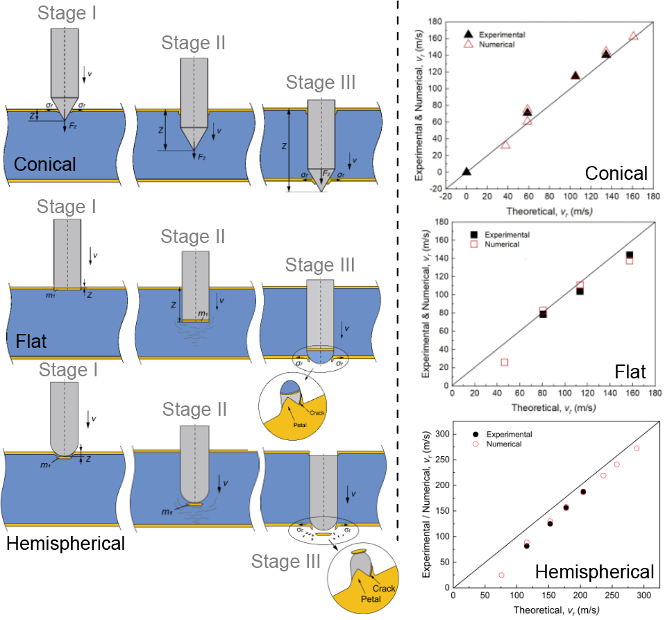秦庆华教授和新加坡国立大学Poh L.H. 教授针对三明治金属泡沫夹芯复合防护的弹道极限问题,系统地开展了三明治夹芯复合防护结构的高速冲击破坏实验(图1),获得了平头、球头及锥头弹体的入射速度、剩余速度以及夹芯复合防护结构被贯穿后的破坏形貌等重要实验数据(图2);提出了泡沫芯材层细观结构重构的高精度新算法,建立了夹芯复合结构跨尺度弹道冲击数值模型(图3);以实验结果导引,提出了三明治夹芯复合防护结构刚性弹体侵彻动力学新理论模型(图4)。研究获得了高速弹体冲击下夹芯复合防护结构的多种新失效模式,揭示了高速弹体侵彻下三明治夹芯复合结构的能量耗散机制,阐明了三明治复合夹芯结构各组成部分的能量分配原理,提出了以复合防护结构抗弹能力为驱动的夹芯复合防护结构质量分布设计策略,回答了在相同面密度条件下如何设计芯材可压缩三明治复合防护结构的迎弹面板和背面板的问题。研究结果表明,较厚的迎弹面设计有利于提高复合防护结构的抗弹性能。