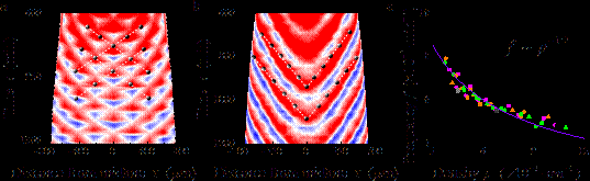 图2 X型波、V型波及其波频与局部密度的幂律关系
