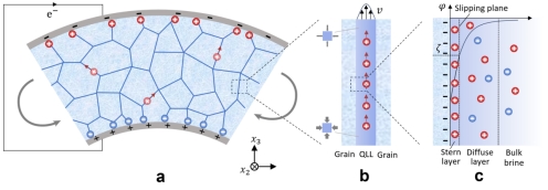 图1.挠曲流电效应的多尺度机理示意图。a,多晶盐冰梁,其晶界因预融化效应被润湿。弯曲驱动晶界盐水层流动而产生可测电流;b,晶界液体通道放大示意图。灰色、黑色和红色箭头分别表示压力、泊肃叶型流动、净电荷迁移;c,界面电双层结构放大示意图。电流的产生源于携带净电荷的扩散层(diffuse layer)相对于紧密吸附的Stern层发生剪切移动