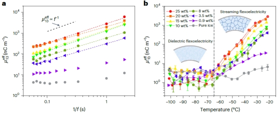 图3.挠曲电效应与挠曲流电效应的区分特征。a,等效挠曲电系数和频率倒数的关系(T=–22 °C)。黑色虚线为斜率为1的参考线;b,等效挠曲电系数随温度的变化(f= 1 Hz)。两幅插图表示液体通道网络在低温下冻结
