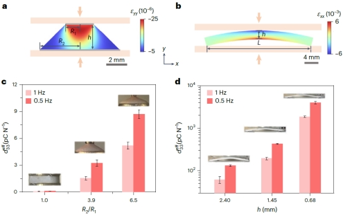 图4.通过结构设计使盐冰具有等效压电性。a, b,圆台和挠曲型梁在压缩下产生应变梯度;c, d,等效压电系数随结构非对称性(c)和梁厚度(d)的变化。NaCl质量分数25 wt %
