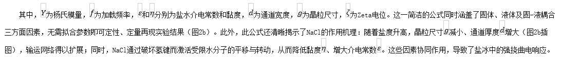 研究团队制备了不同盐度的冰梁,并采用标准三点弯装置进行了挠曲电测试。结果表明,等效挠曲电系数随盐度增加显著升高(图2a,b):在25 wt%时达到约3,较纯冰高约三个数量级。基于图1所示机理,团队建立了理论模型,并推导出等效挠曲电系数的解析表达式: