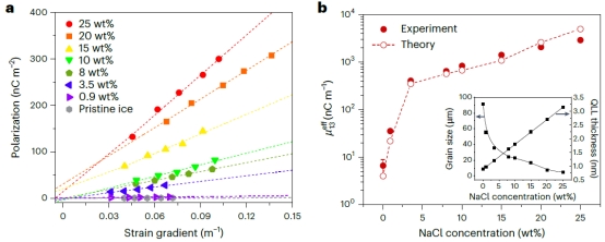 图2.盐冰的增强挠曲电效应。a,不同盐度下电极化与应变梯度的关系及其线性拟合;b,挠曲电系数随盐度变化,实验结果与理论预测吻合。插图展示了晶粒尺寸和准液体层(QLL)厚度随盐度的变化。实验条件:−22 °C、1 Hz