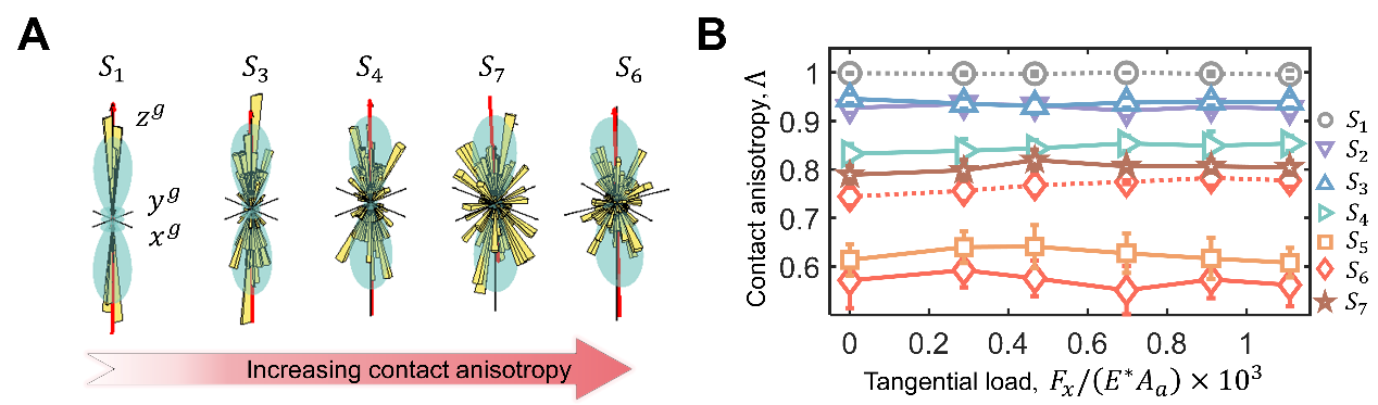 为阐明宏观摩擦响应与微观力学机制之间的跨尺度关联规律,本研究创新性地引入接触织构张量(fabric tensor)来精确量化摩擦副接触匹配水平。研究发现接触织构张量的各向异性指数可作为摩擦强度,即黏滑摩擦临界转变载荷的预测指标:摩擦副的高匹配度使得接触界面表现出更强的几何互锁与能量积累,从而增强了静动摩擦临界转变载荷。研究结果进一步表明,各向异性指数能够准确捕捉剪切过程中微接触取向分布的普适性特征。如图3所示,在界面进入完全滑动状态前,尽管经历了微滑移、弹塑性变形、材料屈服以及微接触突然断裂等一系列复杂力学现象,该指数保持相对稳定。