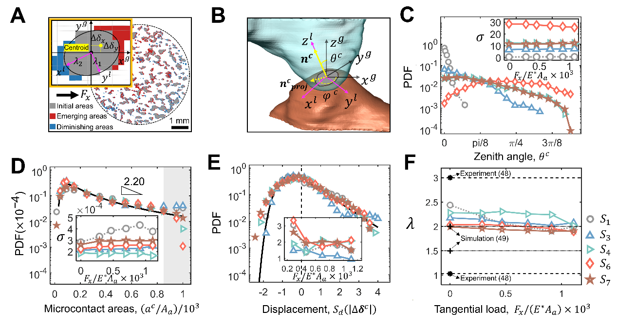为揭示粗糙接触匹配设计的微观作用机制,研究团队利用三维X射线断层扫描(3DXRCT)测量技术,实现了摩擦副接触界面粘-滑过渡过程的原位、实时观测,并成功捕捉到亚微米尺度微接触结构的准静态演化特征。研究结果表明,在不同接触界面匹配条件下,微接触面积、形状、取向及变形等多类关键力学与结构参数均遵循广义极值分布(GEV),呈现出显著地跨尺度统计普适性(如图2)。这一重要发现不仅首次从微观层面揭示了粗糙界面粘滑摩擦行为的内在统计规律,突破了传统摩擦理论对界面行为的描述局限,更为发展高精度、普适性的摩擦预测通用模型提供了坚实的理论基础和实验数据支撑。