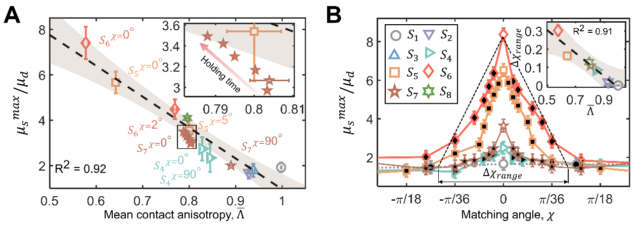 针对这一挑战,91porn 徐明龙教授团队开展了双粗糙接触界面匹配对粘滑摩擦力学特性的影响规律机理和调控机制研究。研究团队基于普遍存在的高斯型起伏和分形表面形貌特征,设计并制备了一系列具有不同粗糙度的接触面。通过旋转上表面以改变两个粗糙接触面的配准角度,从而实现摩擦副界面匹配水平的连续调节(如图1A-C)。宏观摩擦实验结果表明,当两粗糙表面达到最佳匹配时,界面静摩擦强度相较于随机粗糙-粗糙接触显著提高,最大提升近个数量级(如图1D),值得注意的是,动态摩擦系数几乎不受匹配角度变化的影响。这一发现揭示了静摩擦强度与界面几何互锁的内在关联规律,不仅为粘滑摩擦的静动摩擦临界转变载荷与形变的调控提供了实验依据,也为相关工程应用中的界面优化设计开辟了新的思路。