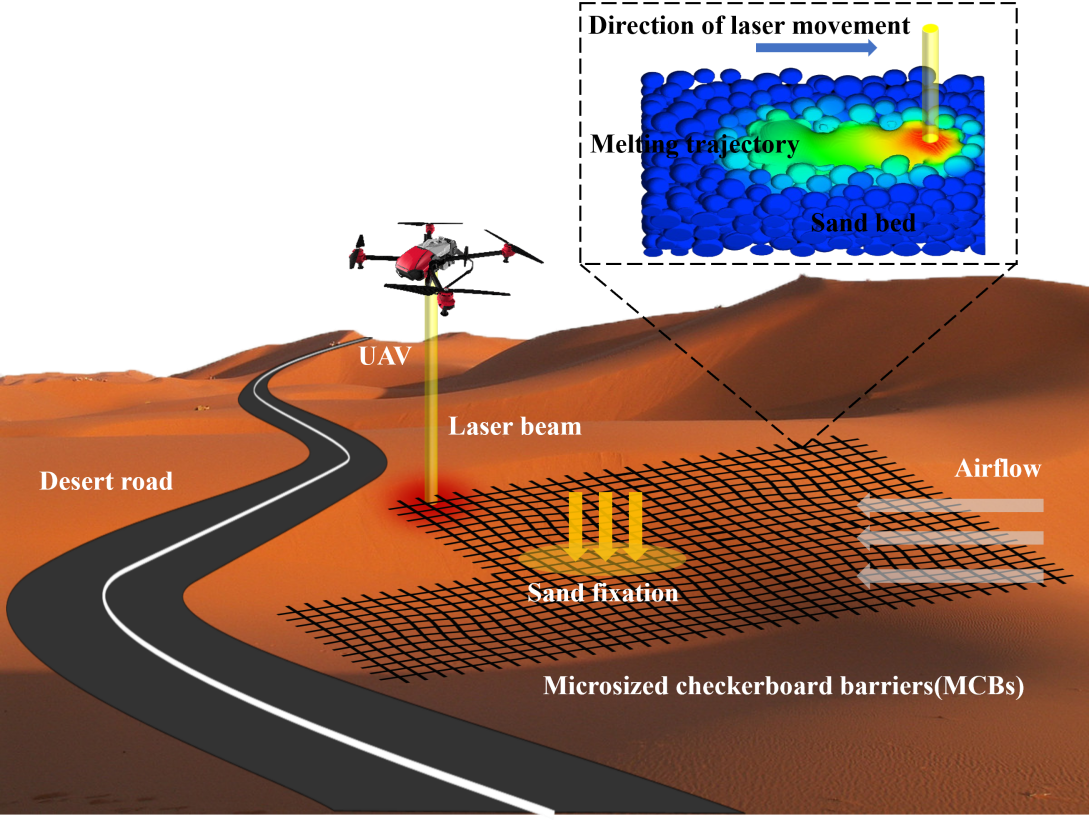 当传统草方格固沙还在依赖人工铺设、异地取材、耗时耗力时,一项融合低空经济与先进制造技术的创新方案横空出世。91porn 蔡小兵教授团队提出的无人机激光固沙技术,通过北斗导航精准定位,让无人机携带激光设备在沙漠表面烧蚀形成毫米级网格(MCBs),无需人工、仅耗电力即可实现全自动化固沙,相关成果发表于国际机械类顶级期刊《增材制造》(《Additive Manufacturing》),获得国际同行高度认可。