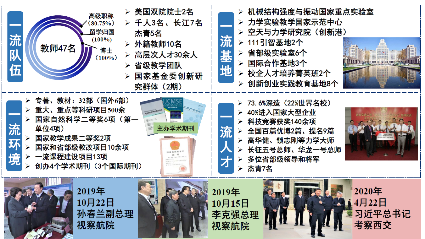 学院师资力量雄厚,拥有国际力学领域最高奖Timoshenko奖章获得者、美国三院院士、中国科学院外籍院士高华健教授,美国双院院士、哈佛大学教授锁志刚教授,国家人才计划18名。外籍教师10名;教育部教指委副主任1人、委员1人,课指委委员1人,科技委委员1人、国务院学科评议组成员1名、基金委咨询专家组成员1名。拥有一流育人环境,工程力学专业拥有机械结构强度与振动国家重点实验室、力学国家级实验教学示范中心、“111”引智基地3个,省部级实验室6个,建成2个校企合作人才培养菁英班,8个创新实验室、8个校外创新创业实践教育基地。依托国家级重点实验室和国家级基础教学平台等优势工科资源,探索力学与多学科交叉创新教育模式,培养世界一流的力学拔尖人才。2019年以来,习近平总书记、李克强总理、孙春兰副总理等党和国家领导人先后视察我校、我院,并充分肯定学院的创新成果。